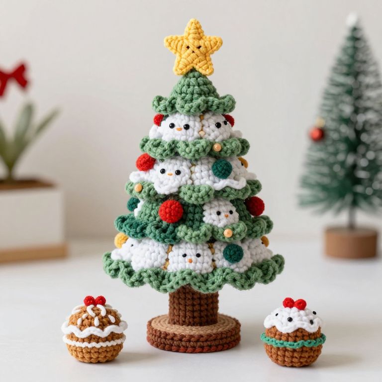 Photograph of a crocheted Christmas tree with a yellow star atop, adorned with white, green, and red pom-poms, and small white, smiling crocheted faces. The tree is on a brown base, flanked by two crocheted cupcakes with red and white icing. In the blurred background, another crocheted tree is visible. The white background and soft lighting enhance the colorful, handmade textures of the crocheted items.