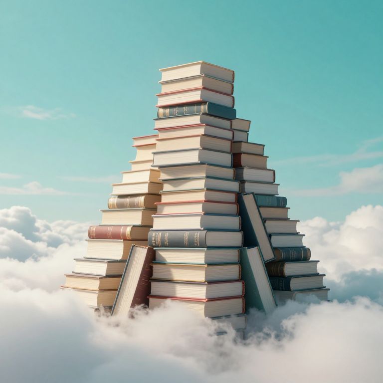 Digital artwork of a towering pyramid made from stacked books, set against a bright blue sky with fluffy white clouds. The books vary in size and color, with white, beige, and red covers, and some have visible titles. The pyramid leans slightly to the right, with books tilted and edges exposed. The image has a surreal, dream-like quality, with crisp, clean lines and vibrant colors, emphasizing the contrast between the solid books and the soft, ethereal clouds below.