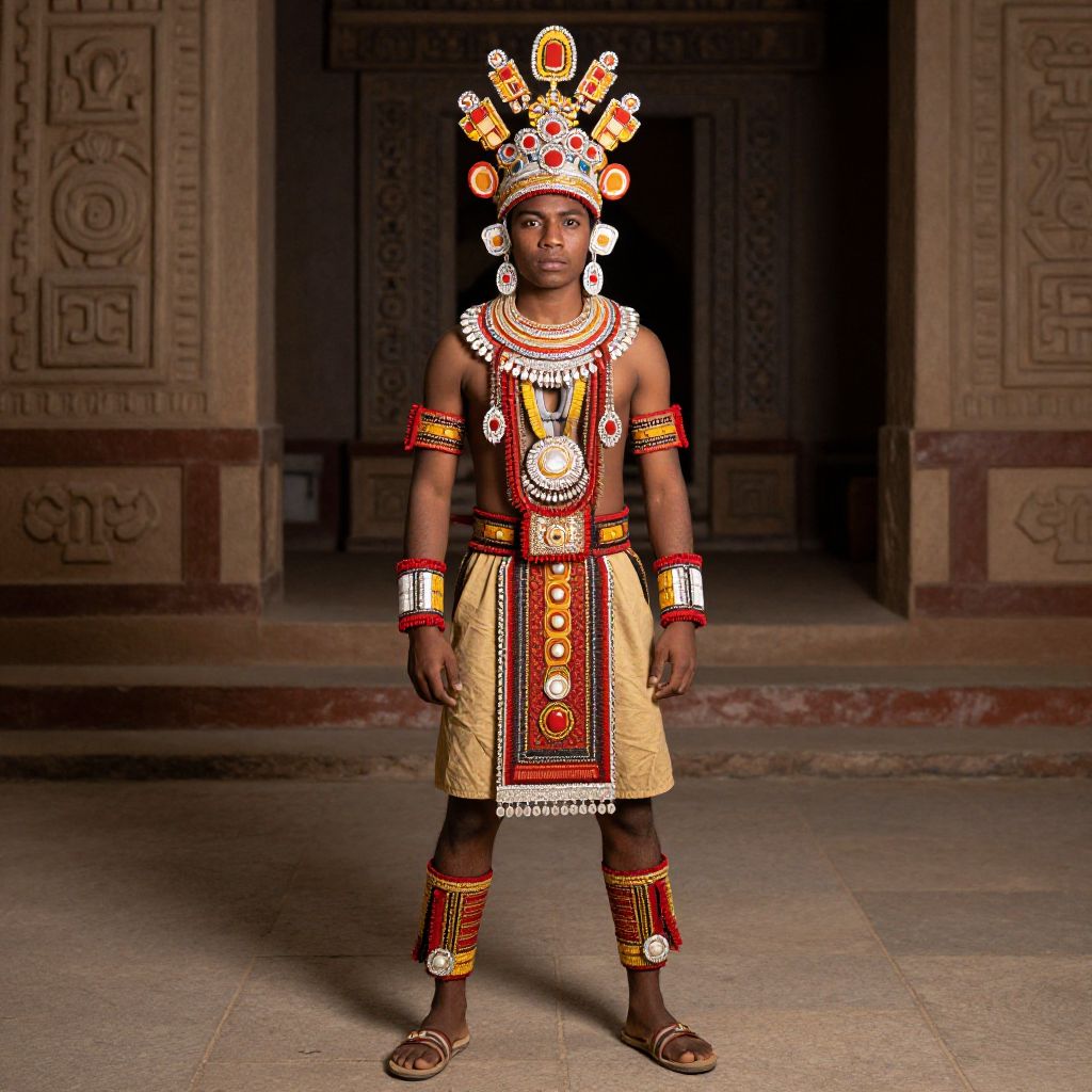 Photograph of a young African boy in traditional Indian-style ceremonial attire, standing in a dimly lit, intricately carved stone building. He wears vibrant