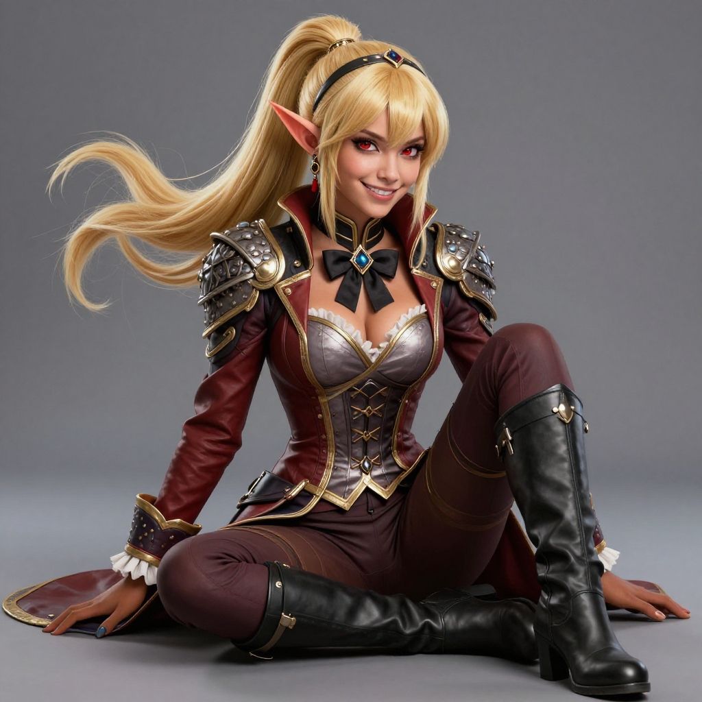 Chloe, pony tail, (absurdres, newest), 1girl, solo, Blonde hair, Very long hair, small breasts, light_smile, Smile, earrings, headband, forehead_jewel, athletic, vest, upper body, boots, long sleeves, red eyes, elf, pointy ears, elf ears, smiling, upper teeth, (Covered Body), hairband, smug, ribbon, bangs, ( pauldrons, armor), brown skin, dark skin, Dark elf, (dark-skinned female:1.2), r1d3r, jacket, tailcoat, tiara, pants, trim, cuffs, frills, corset, stand-up collar, bowtie, brutal smile, seductive eyes. high heel boots, knee high boots, black footwear, sitting, highres, sharp focus, (ultra detailed, extremely detailed), (photorealistic artwork:1.37), (extremely detailed CG unity 8k wallpaper), (((vibrant colors, vibrant theme))), (intricate), (masterpiece), (best quality), petite