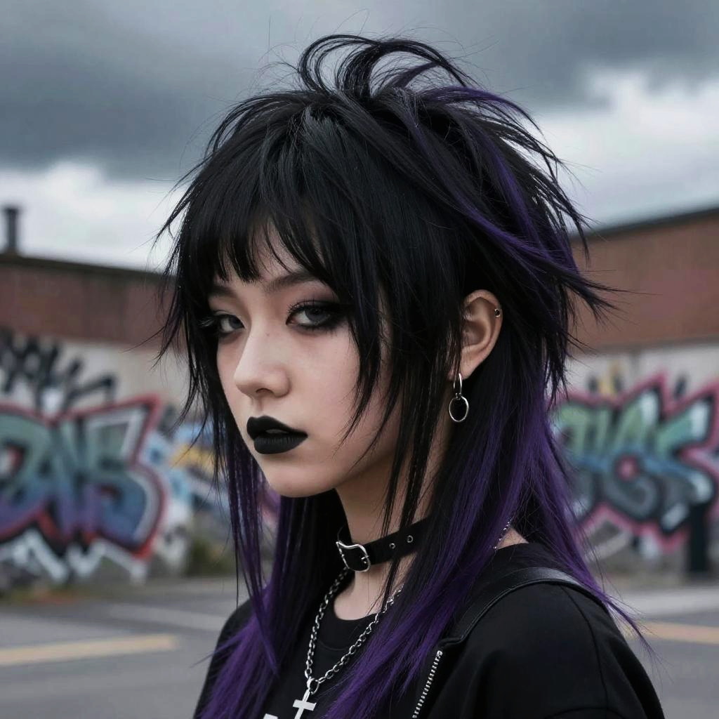 Emo goth hairstyles featuring sharp layered cuts with jet black and deep purple hues, styled with teased volume and side-swept bangs, set against a moody urban backdrop with graffiti and dark skies, capturing a rebellious alternative fashion vibe.