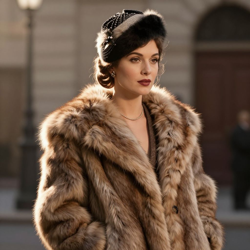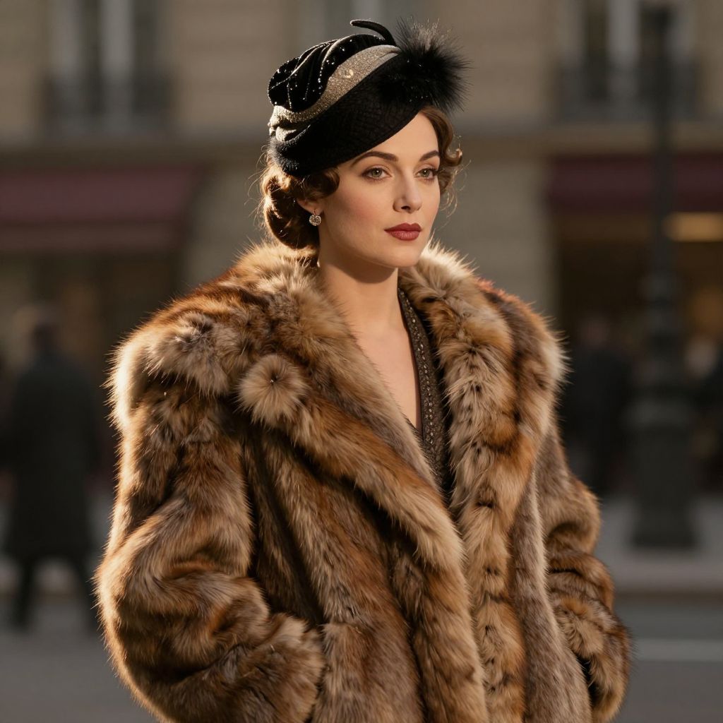 A high-definition digital rendering captures a French woman in 1930s fashion, adorned in luxurious fur accessories, including a voluminous coat and hat, exuding elegance against a vintage urban backdrop with dramatic lighting effects.