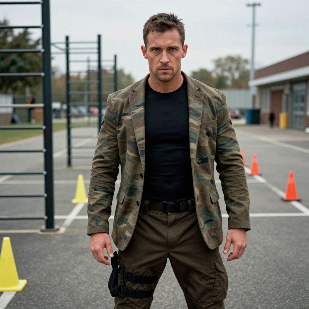 A man, camouflage print blazer, dark brown tactical pants, black fitted t-shirt, urban edge, outdoor training area, obstacle course setup, safety cones scattered, chromogenic film style, focused expression. Man has masculine face and piercing eyes