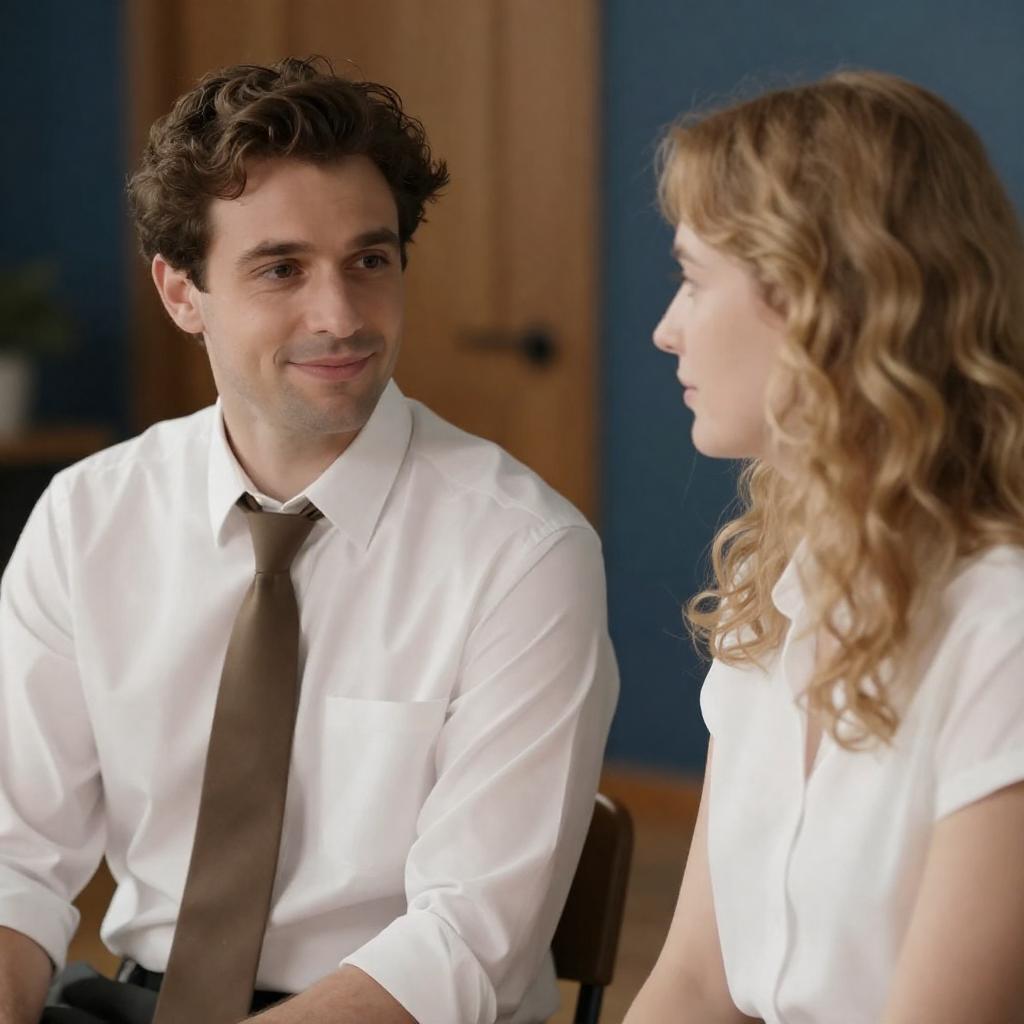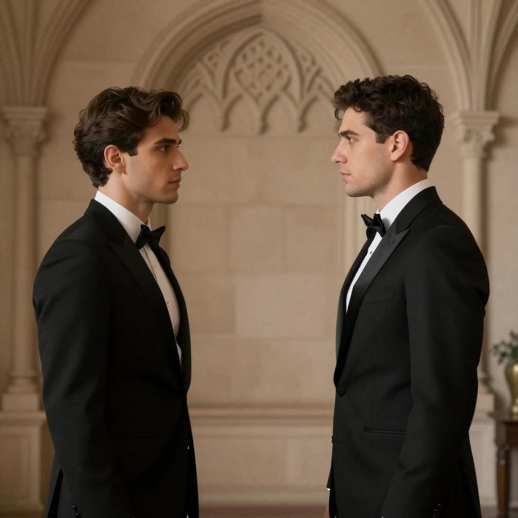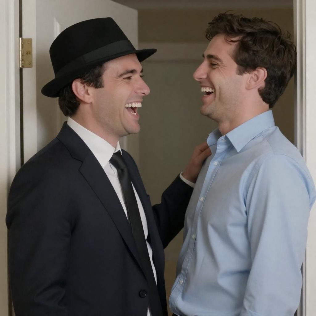 Photograph of two men in a kitchen. The man on the left, in a brown suit and striped tie, leans forward, grasping the arm of the man on the right, who is smiling and wearing a white shirt with a striped tie. The man on the right has curly dark hair. Both men have intense expressions. Background includes a kitchen appliance.