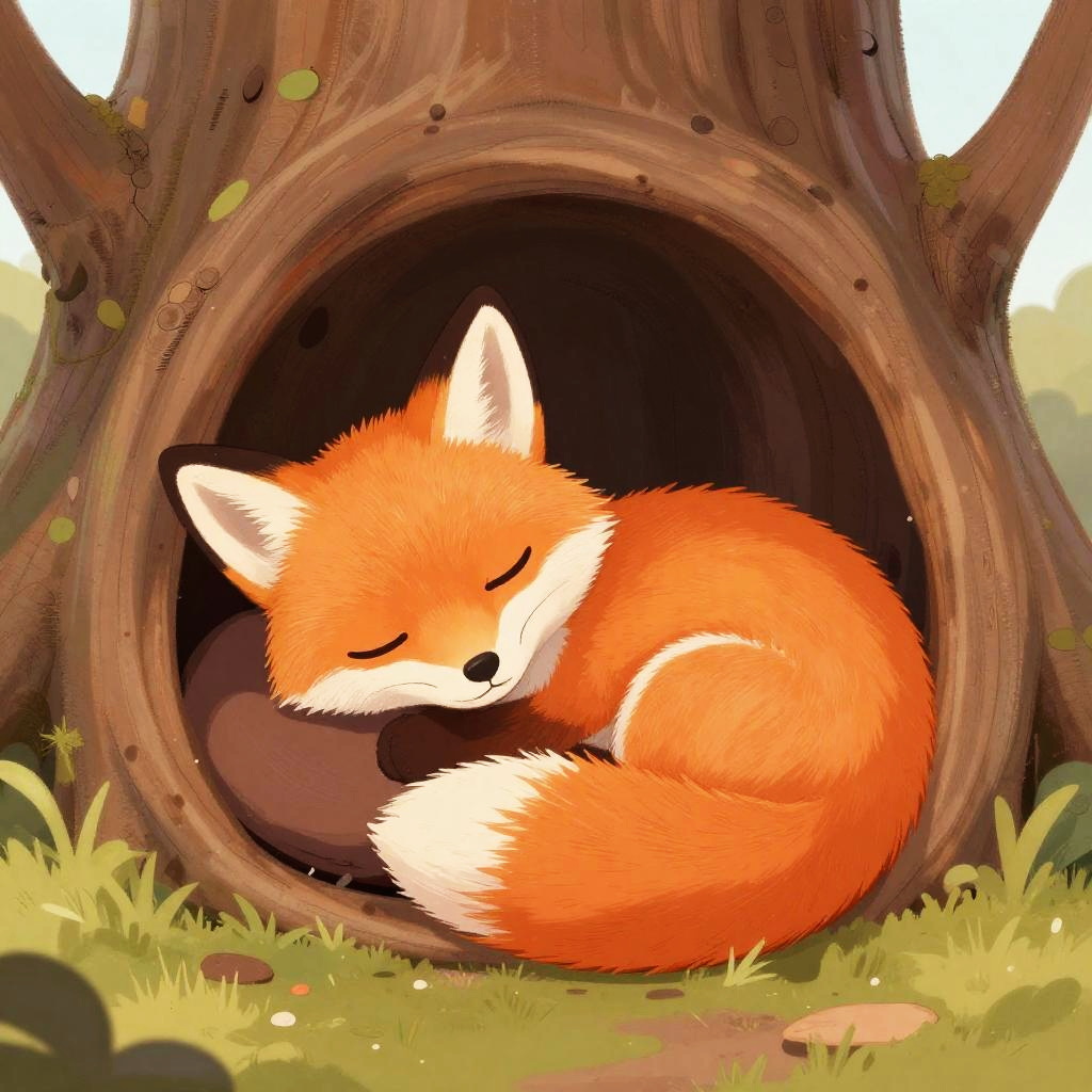 Fox cute cartoon curled up sleeping inside a hollow tree, gentle pastel colors, round shapes, delicate fur details, peaceful and endearing mood, storybook art style