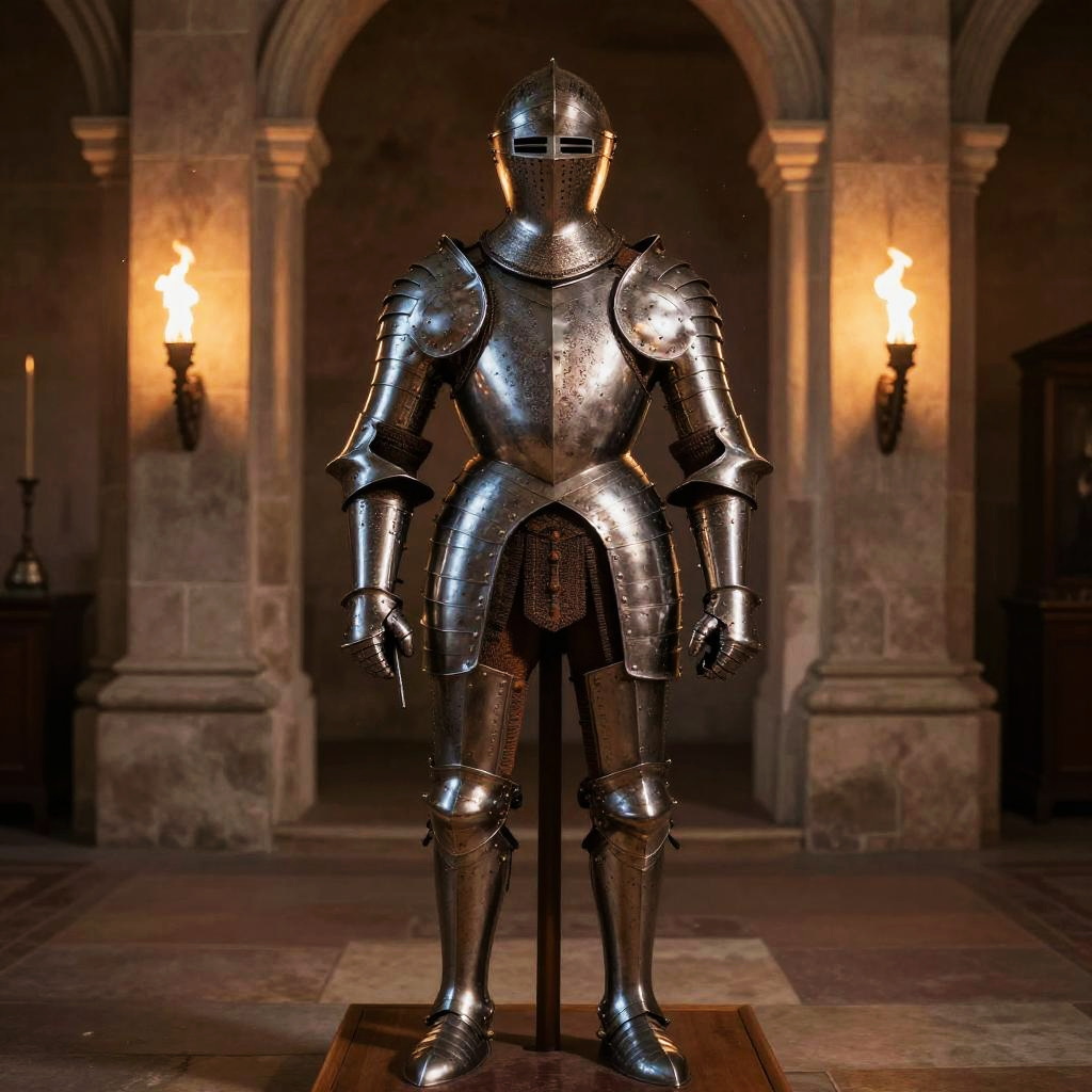 Knightly armor displayed on a wooden stand inside a grand stone armory, featuring elaborate helmet designs, layered plates, and rich textures, illuminated by flickering torchlight and dust particles in the air.