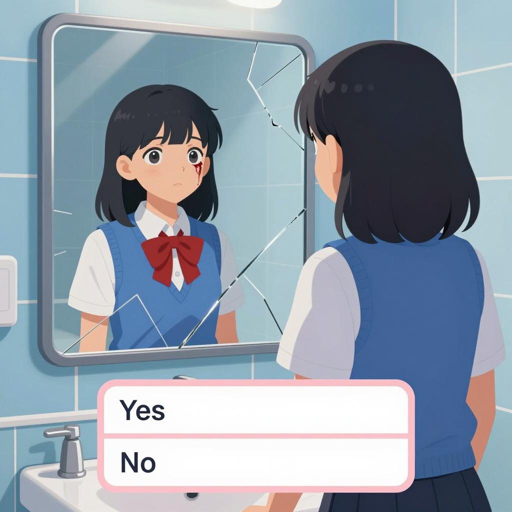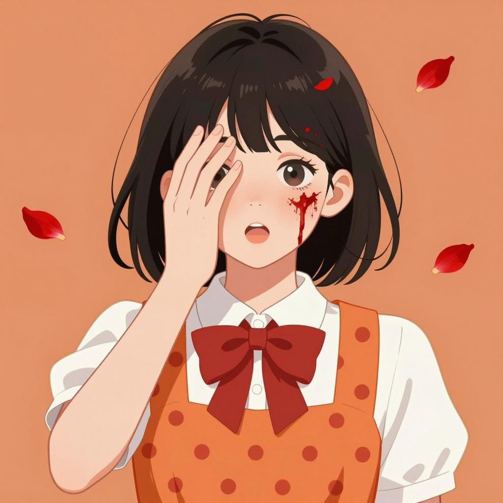 Illustration of a young woman with short black hair, wearing an orange dress with red polka dots, a white blouse, and a large red bow tie. Her right hand covers her blood-stained face. Red petals float around her head. Orange background. Intense expression, mouth slightly open. Upper body view.