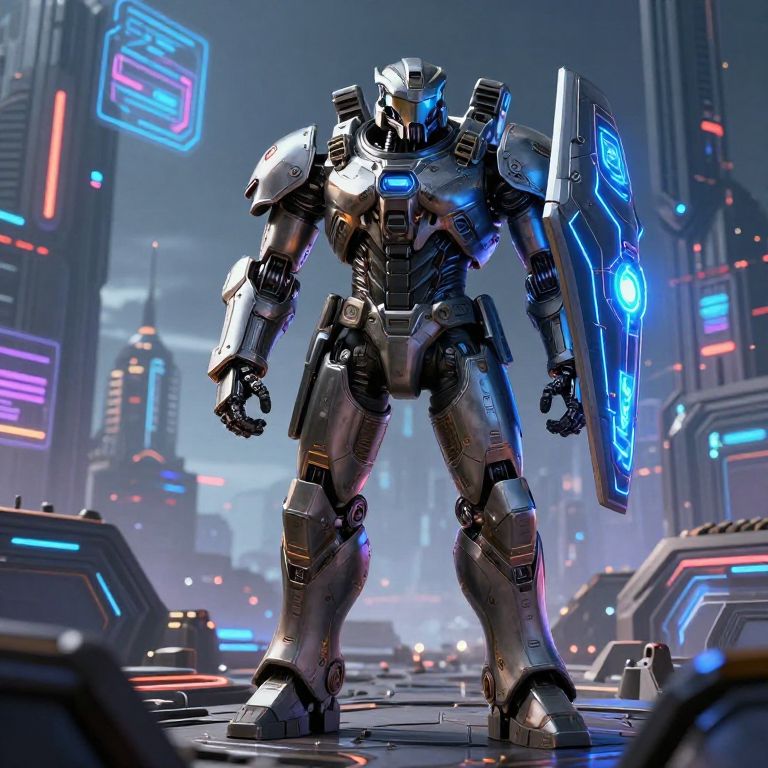 CGI image of a futuristic, silver robotic warrior with glowing blue lights, holding a neon-blue shield, standing in a neon-lit cyberpunk city