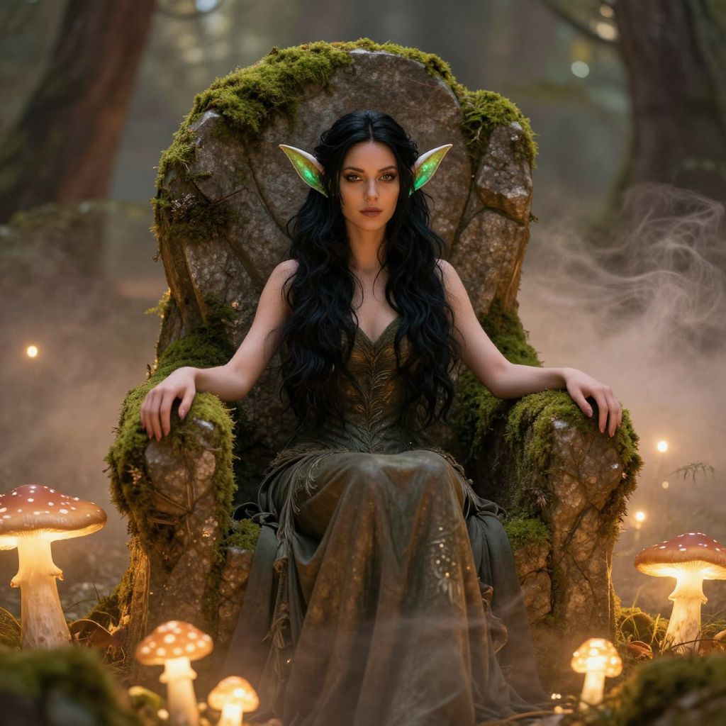 Photorealistic digital artwork of a dark-haired, pale-skinned elf woman with pointed green ears, sitting on a moss-covered throne in a forest. She wears a dark, ornate dress with intricate patterns. Her long, wavy hair cascades over her shoulders. The throne is surrounded by glowing mushrooms, with mist and soft light filtering through the trees in the background. The scene has a mystical, fairy-tale atmosphere, with a focus on the enchanting forest setting and the ethereal beauty of the elf woman.