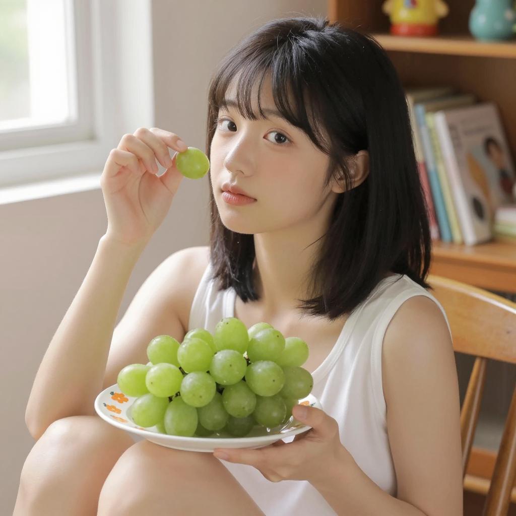 Young Asian woman with straight dark brown hair and bangs, wearing a floral sleeveless top, holding a large slice of watermelon in front of her mouth. Green foliage in the foreground and blurred background with wooden shelves. She looks directly at the camera with a slight smile. Her right hand holds the watermelon slice, and her left hand supports it from below. Her expression is calm and focused. The image is a photograph.