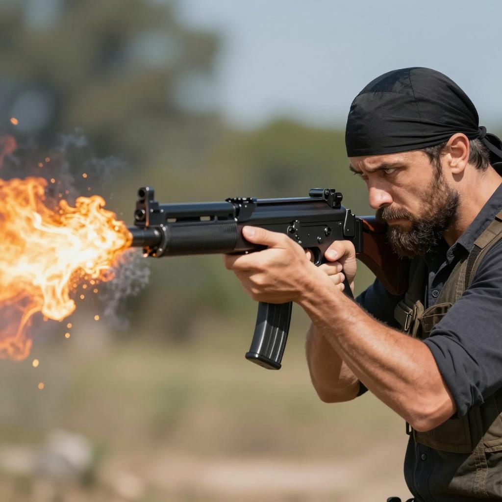 Photograph of a muscular man with short brown hair, holding a black submachine gun, facing to the side. He has a focused expression, and his left arm is visible. Background shows green, blurred jungle foliage. Man wears a black sleeveless shirt. Light shines from the top left, highlighting his face and gun.