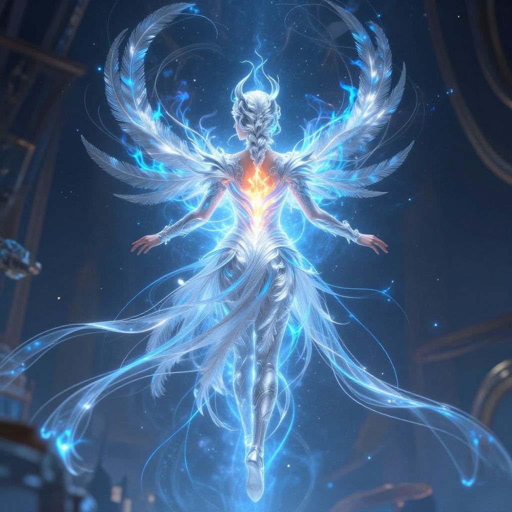 Surreal, realistic, woman of silver, from behind, at a distance, flying, weaving light and blue fire, plumage, fiery glow from chest, flow, lines, floating ribbons of light and blue fire, particles in the air, in a floating city, complexity of details, patterned object, high resolution, beautiful face, linquivera, codamsel