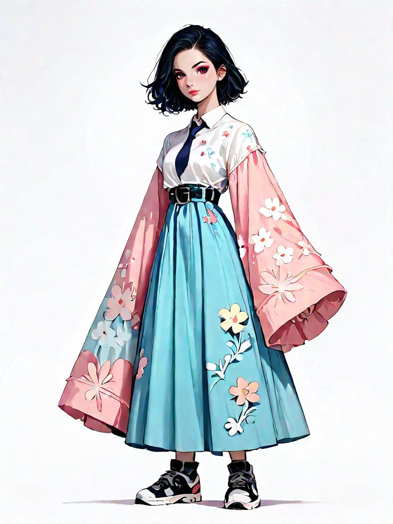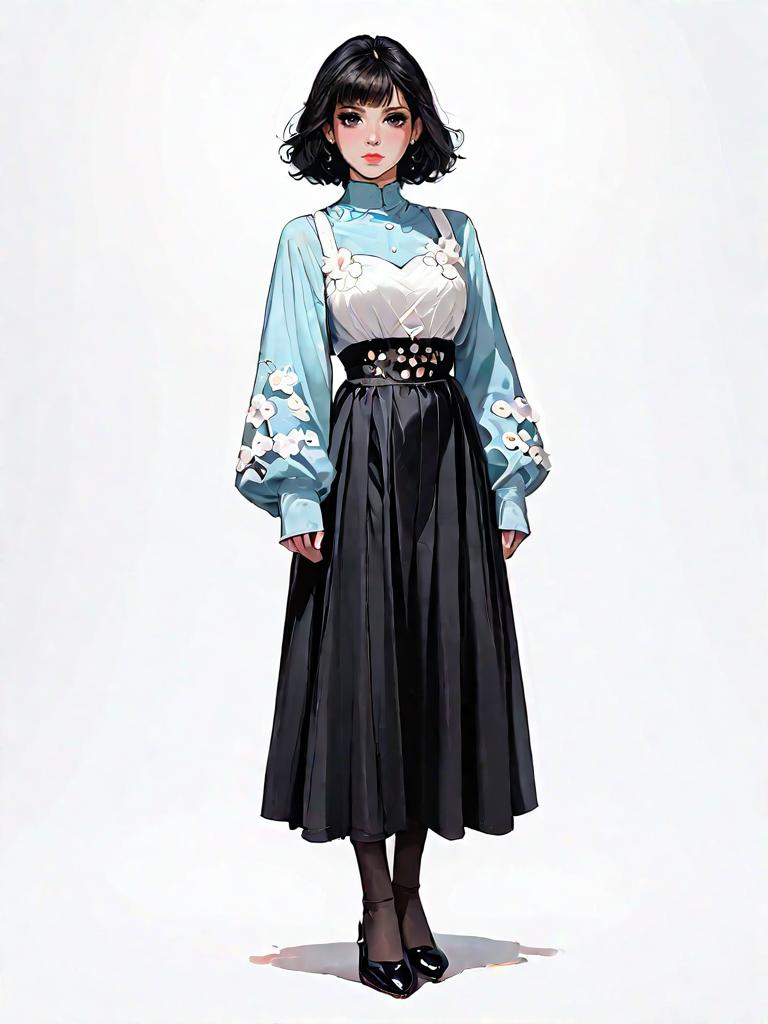 1girl, source_comics, realistic face, full body shot, Woman, casual chic, navy blue skater dress with small floral print, scoop neckline, long sleeves, fitted waist, flared skirt, mid-thigh length, plain white background.