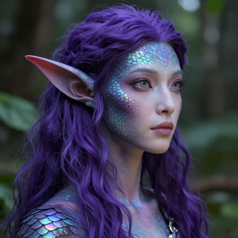 Craft a photorealistic portrait captured on an iPhone, featuring an enigmatic figure from a rare race with elongated ears and vibrant iridescent scales adorning their skin. Their piercing gaze, fixed upon the distance, is framed by a cascade of deep purple hair. Soft ambient light filters through verdant foliage, enhancing the subject's refined features and striking appearance, creating an enchanting atmosphere that evokes wonder, curiosity, and introspection.