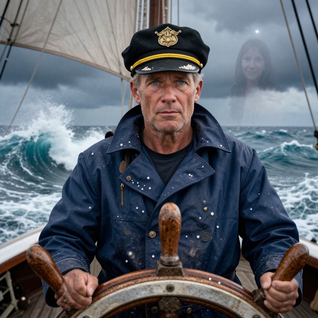Create a double exposure portrait of a rugged pearl diver, his piercing blue eyes and sun-creased face telling tales of countless voyages. He wears a worn black captain's hat, adorned with a brass emblem, and a well-tailored navy coat, stained with saltwater and age, drapes his shoulders. His strong hands grip the helm of an antique ship's wheel, set against a vast ocean scene of towering waves and a stormy horizon. Crashing waves, billowing sails, and a distant, ethereal figure of a smiling girl evoke a sense of adventure and mystery. Achieve a masterful blend of the man and his maritime world through expert layering, capturing nature's raw power and the deep-seated desire for safe harbor in one captivating image, with the resolute gaze of the diver fixed on a distant star - his guide home.