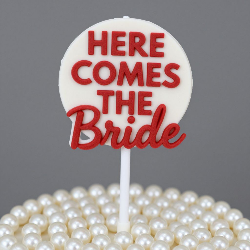 Delicate white cake pop featuring bold red text reading 'HERE COMES THE Bride' stands elegantly atop a bed of shimmering white pearls, creating a romantic wedding-themed treat.