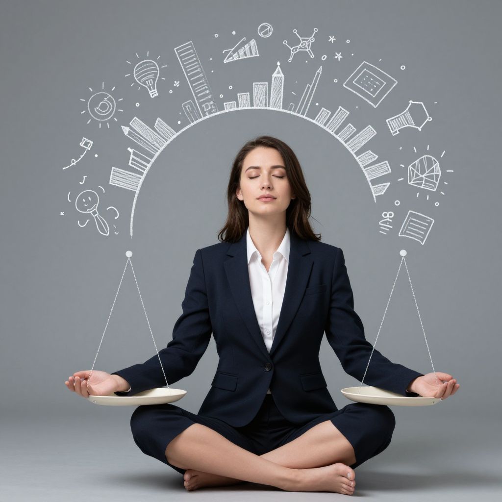 In a serene embrace of balance, a businesswoman finds harmony between mindfulness and ambition, her closed eyes and open mind weaving a tapestry of inner peace and strategic vision, as the rising graph in her thoughts symbolizes the growth nurtured by calm determination.