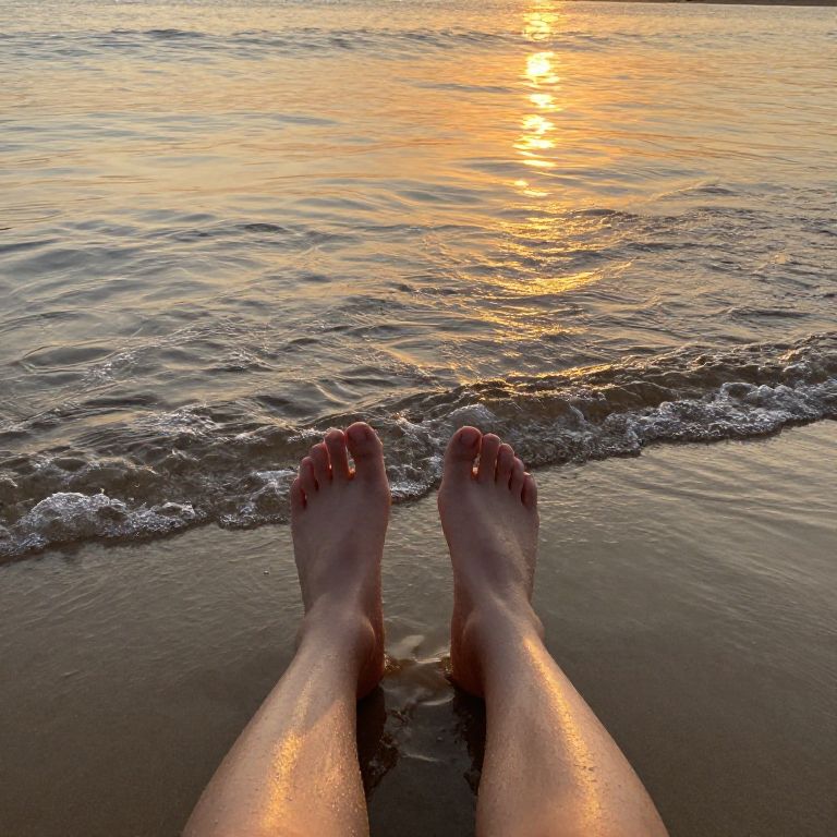 Photograph of two glistening feet in shallow water at sunset, with golden sunlight reflecting on the gentle waves.