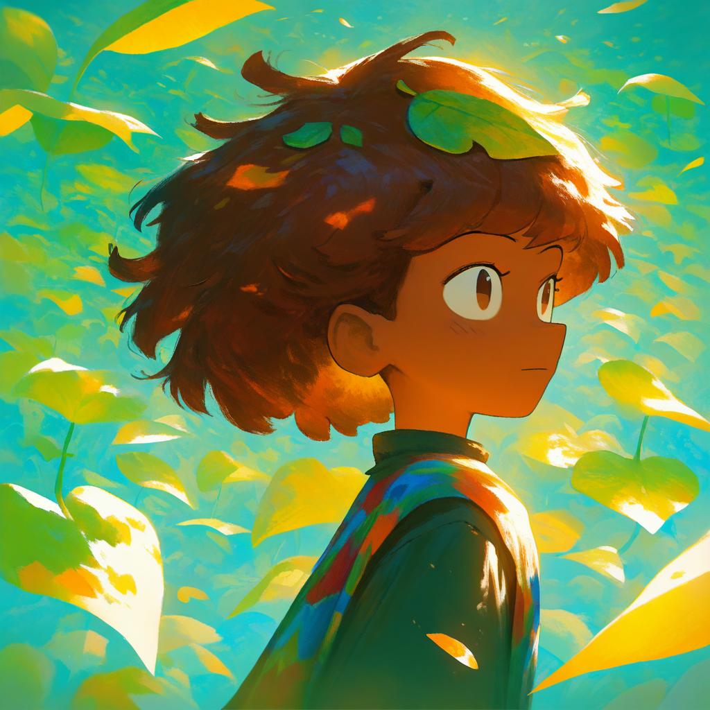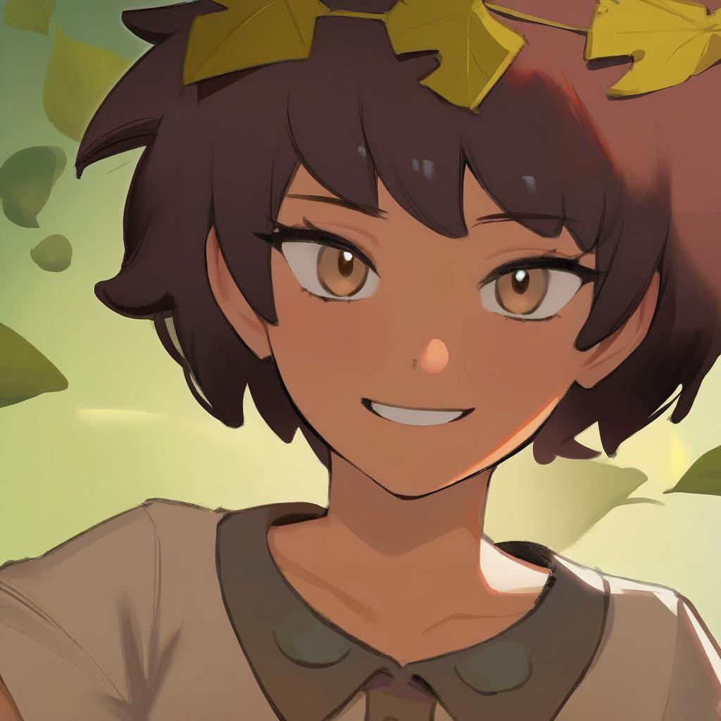 Anne boonchuy, amphibia, 1girl, dark-skinned female, brown eyes, brown hair, short hair, leaf on head, by artist satori (aosky9077), animagine