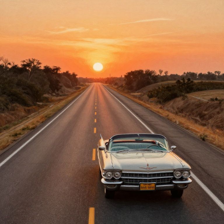 Far away, top down shot, 1963 cadillac convertible driving down empty highway into a bright orange sunrise, oil pastel, high detail, realistic, vintage, sepia