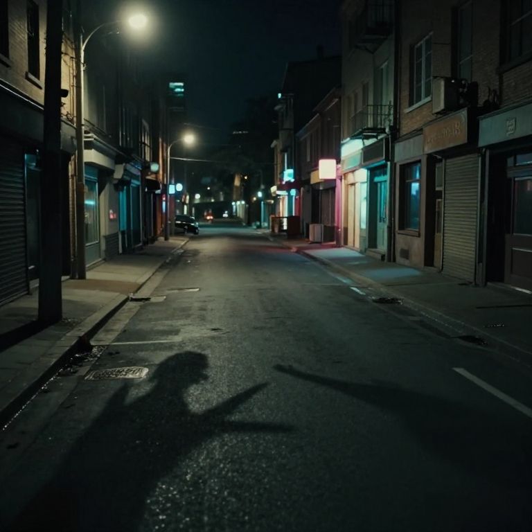 Nighttime photograph of a deserted, dimly-lit urban street with neon signs, closed storefronts, and a shadowy figure walking.