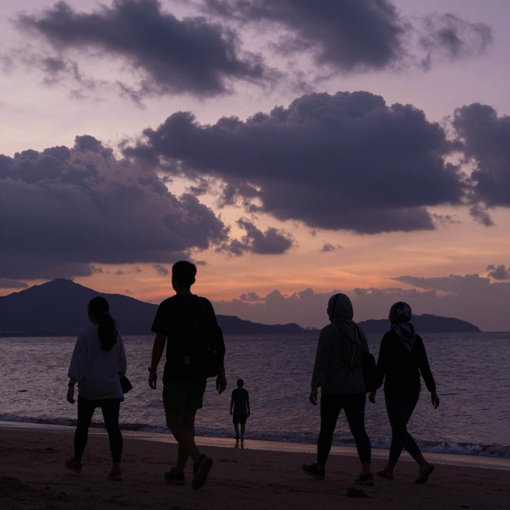 Photograph of a crowded street. A woman in a red patterned dress walks ahead with a young boy. A man in a blue shirt walks beside her. A woman in white and another in yellow walk further back. Dense foliage on the right. Various people, casual clothing, and striped awnings on the left. Overcast lighting.