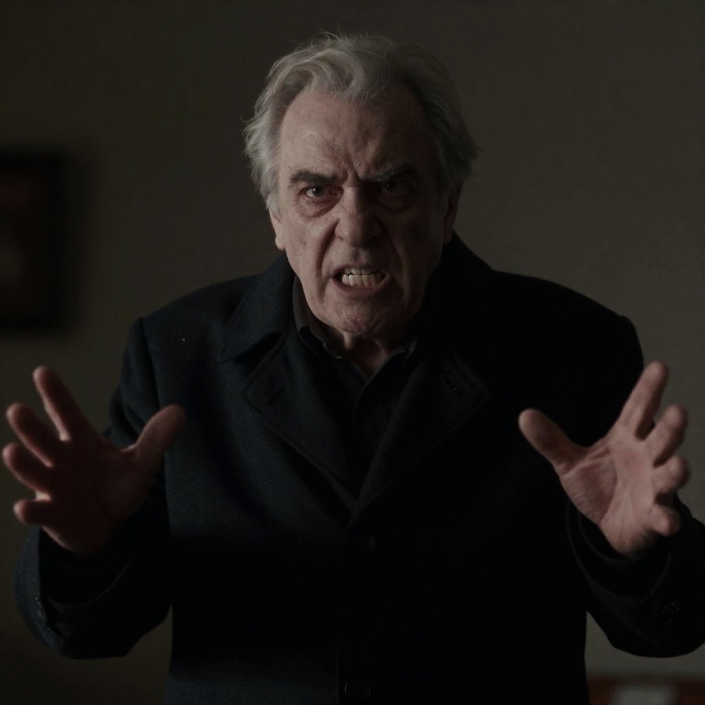 Old man with gray hair, pale skin, and a wide, angry mouth. Wearing black coat, hands outstretched. Dark background with shadows of objects. Intense expression, light focused on his face. Film still.