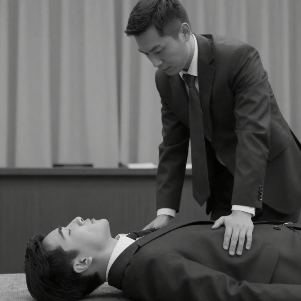 Black-and-white photograph of three men. Two men in suits stand, one leaning over a man lying on the floor. Lying man's face is partially visible, head back, eyes closed. Background features vertical curtains and a table. One standing man has intense expression.