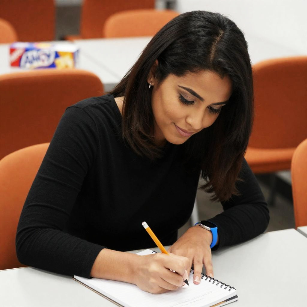Photograph of a woman with dark brown shoulder-length hair, wearing a black long-sleeve top, leaning forward over a table, writing with a pencil on a spiral notebook. Orange chairs and a table with a box of Nabisco Chips Ahoy in the background. She has a slight, confident smile and intense gaze. Bright lighting from the right. One blue wristband on her left wrist.