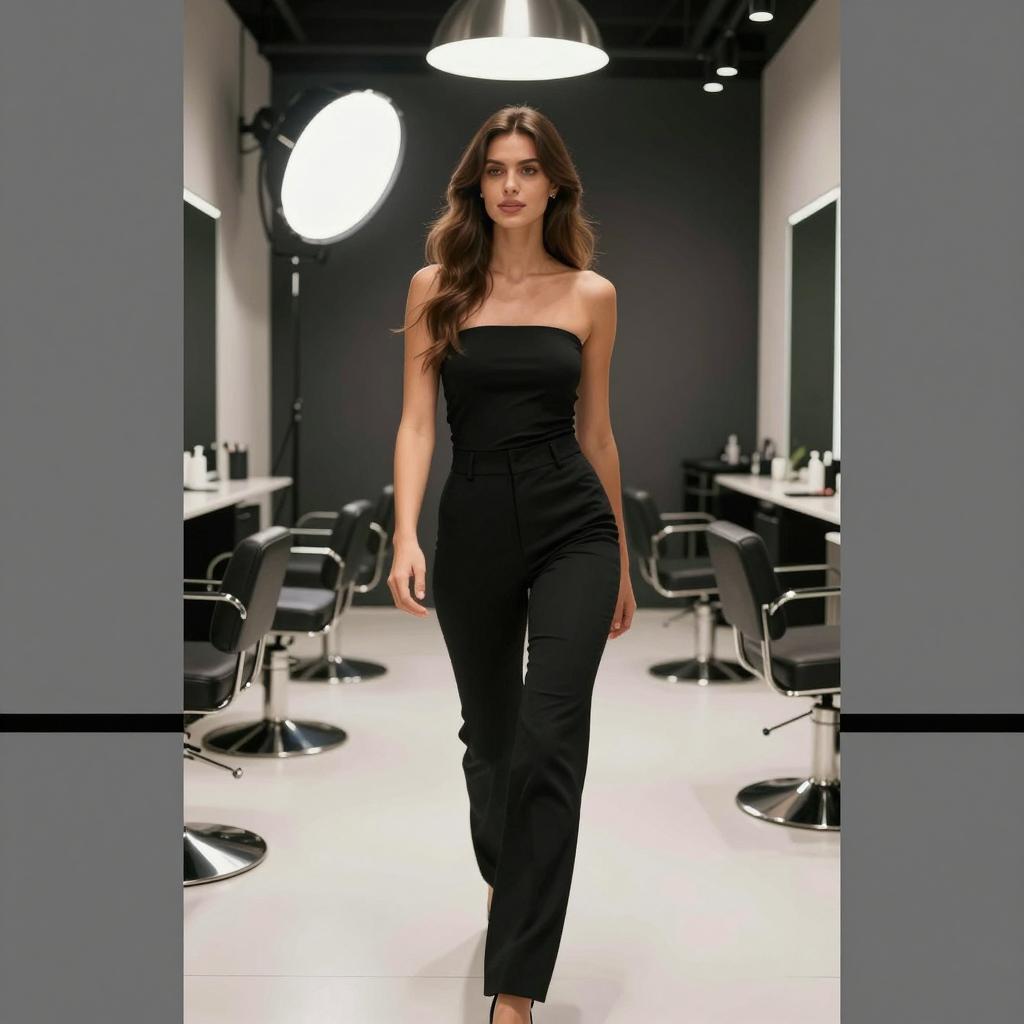 Photograph of a woman with long brown hair, wearing a black tube top and black high-waisted pants, walking in a modern, dimly-lit salon with large industrial lights and metallic fixtures. She is centered, looking slightly to her left. The background includes mirrors and a ured white floor. Her arms are relaxed at her sides. The image is bordered by a gray rectangle with a black line at the bottom.