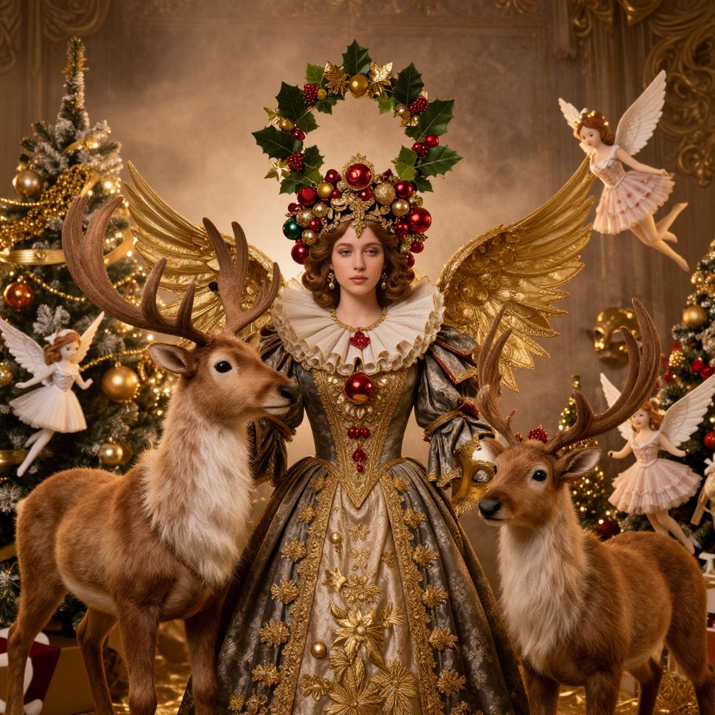 Photograph of a regal woman with golden wings, red and gold Christmas wreath, ornate dress, flanked by reindeer, surrounded by
