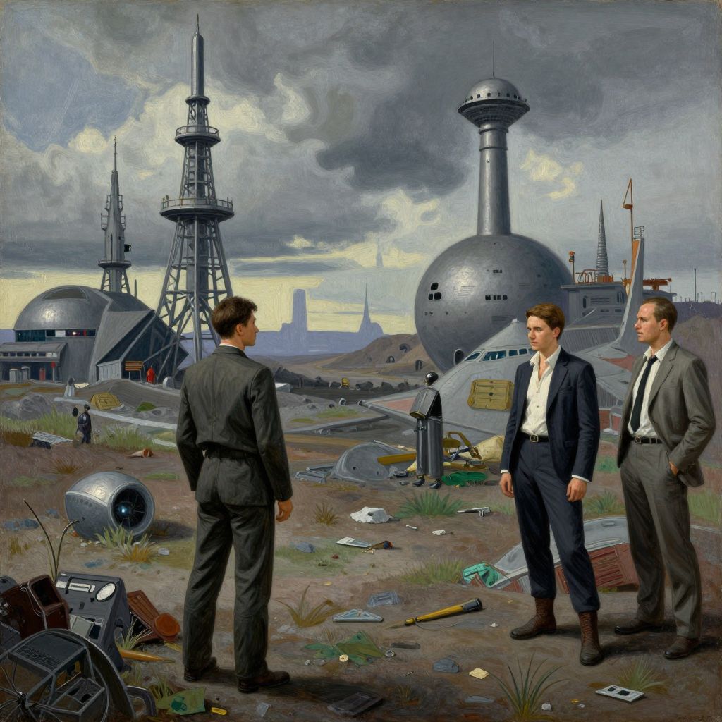 This digital painting depicts three men in dark suits standing in a desolate, post-apocalyptic landscape filled with scattered debris. The men are positioned in the foreground, facing each other and a row of futuristic, ruined military structures in the background. The structures include large, spherical and cylindrical towers with antenna-like appendages, under a cloudy, gray sky. The ground is barren with patches of grass and scattered metal objects. The men have serious expressions, with the central figure in a white shirt, and the others in black suits. The overall style is realistic with a slightly surreal, dystopian atmosphere.