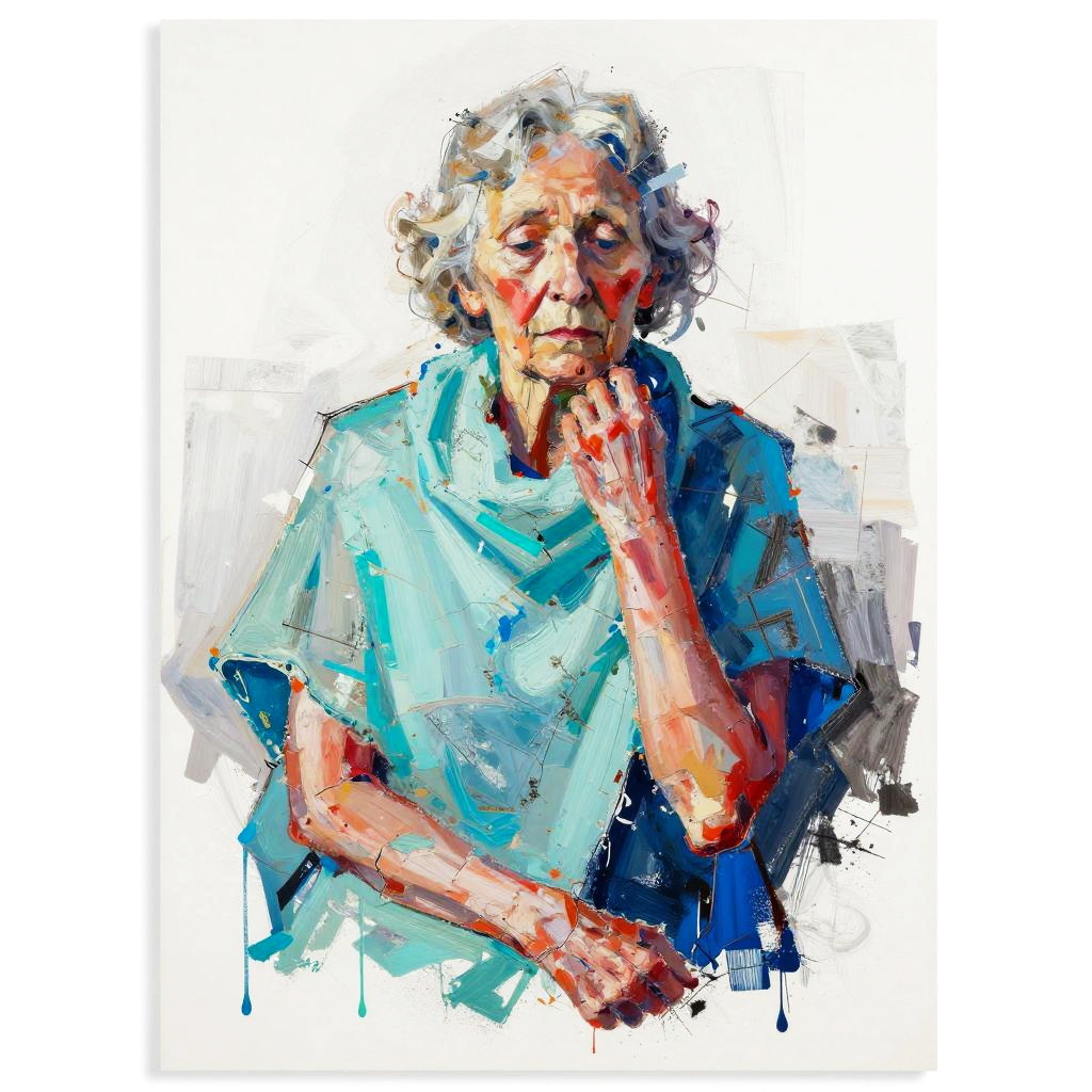 Expressionist semi-abstract portrait of abstracted elderly woman with aquamarine shawl and fractured cherry-red limbs, rendered in mixed-media oil collage highlighted with rough charcoal accents and textured scrapes, high-contrast bold colors, loose gestural strokes and textured paint ridges, minimal white negative space with asymmetrical crop, cobalt-shadow accents and suggestive contours, emotive poignant serenity underscored by latent sorrow, contemporary art poster vibe, painterly chaos with subtle drips, unresolved edges, luminous highlights.
