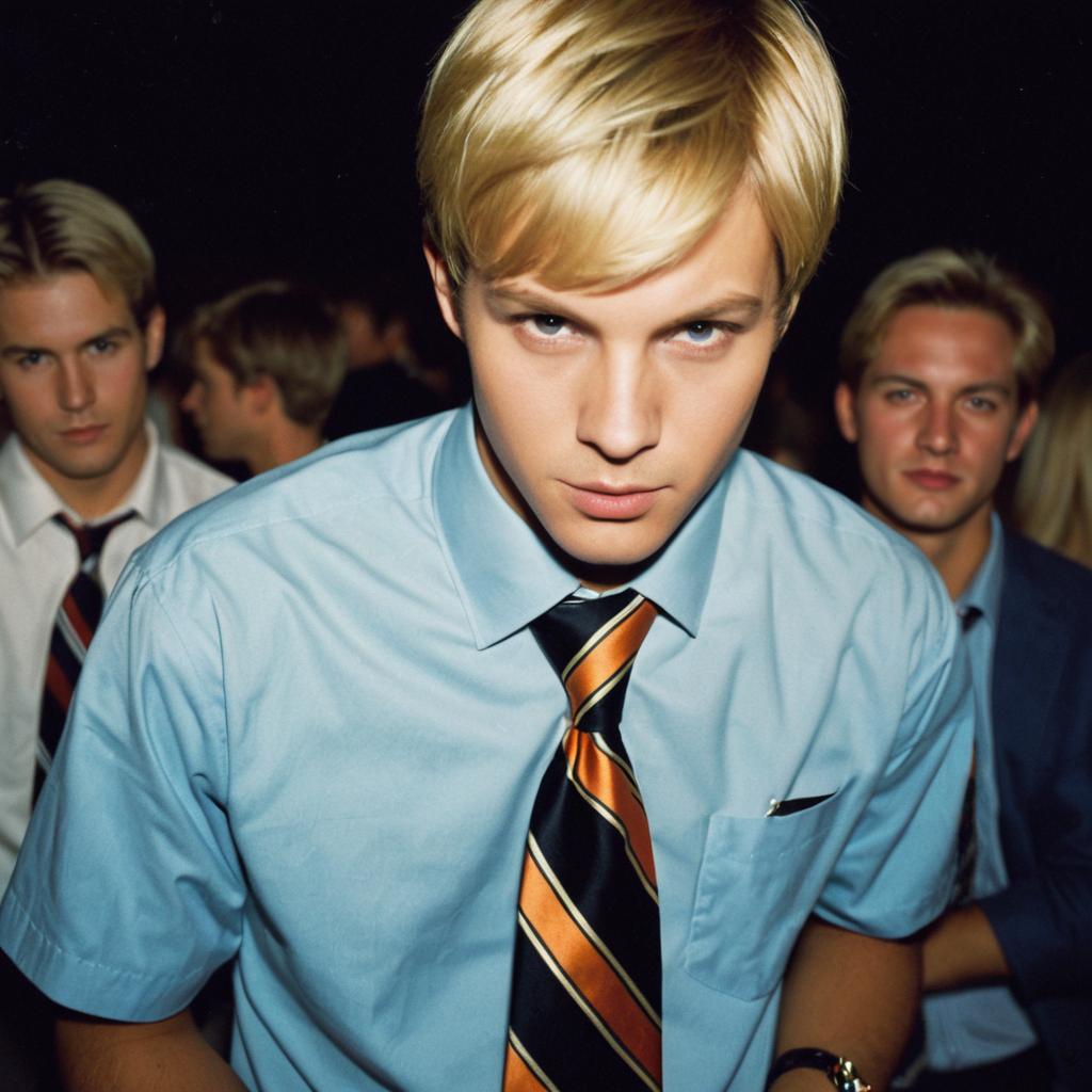 Summer bar outfit guys,blonde hair, 1girl, dress, long hair, multiple boys, solo focus, bar (place), crossed legs