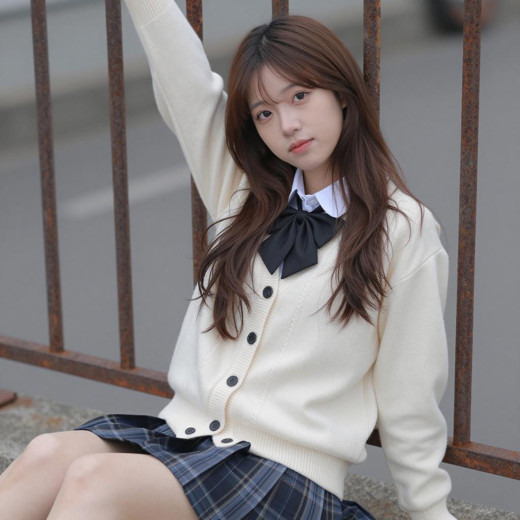 Asian woman with long brown hair, white short-sleeved shirt, brown plaid skirt, black knee socks, sitting on wooden deck. She has pale skin, bangs, and a neutral expression. Background includes metal railings and blurry buildings. She sits with legs apart, right hand raised, left hand on the ground. "CKS & JAPAN" on the left.