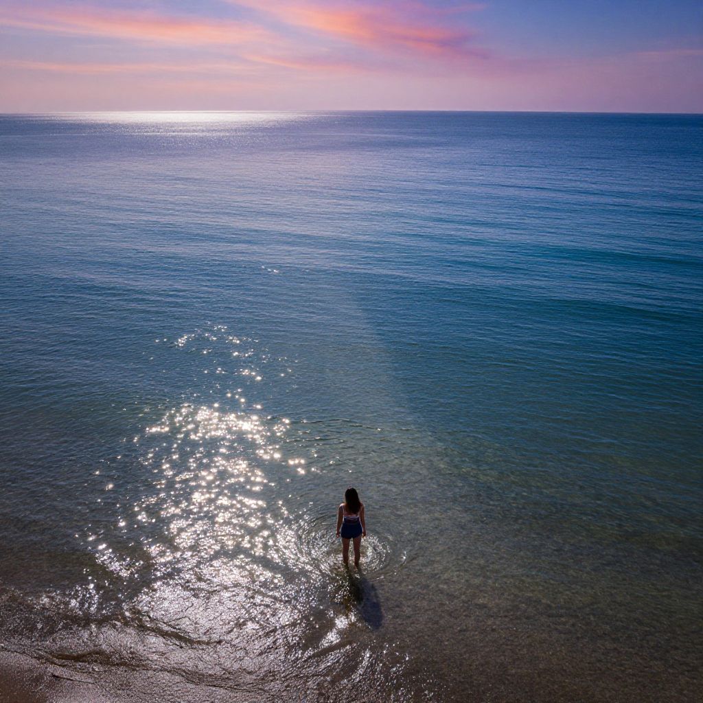Picture a breathtaking seascape, rendered in photorealistic detail. From an aerial perspective, it depicts a young woman standing knee-deep in shimmering water on a barren shore. Behind her, undulating waves of deep blue and green liquid extend endlessly towards the horizon, mirroring the vivid colors of a surreal sky above. The sun's rays pierce through this watery expanse, casting ephemeral shadows that dance across the scene as if alive, evoking feelings of awe, curiosity, and wonder in viewers who are drawn to explore this enigmatic emotional landscape. This mesmerizing seascape challenges perceptions and invites contemplation on the nature of reality itself.
