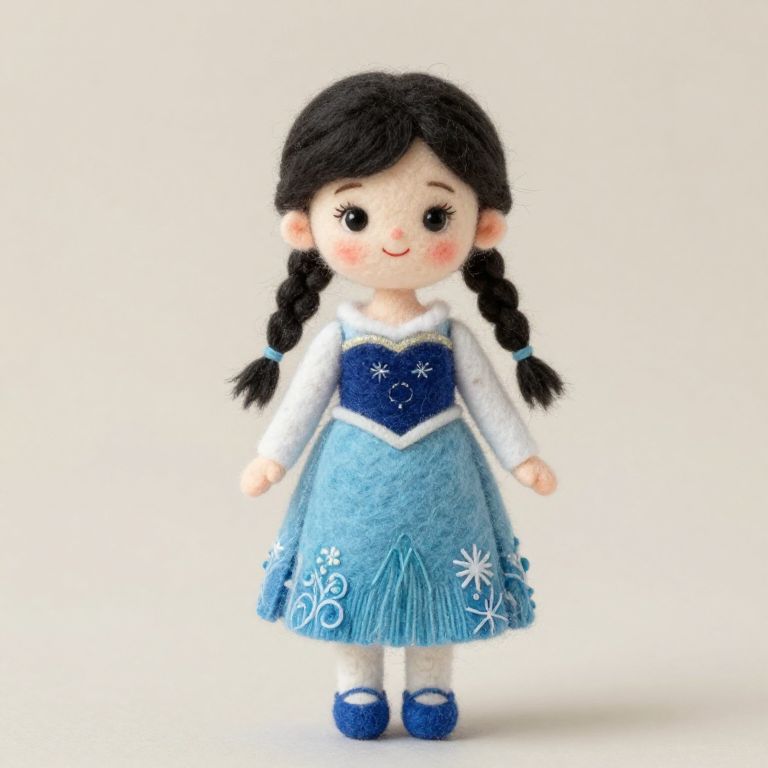 Felted full body image of a cute 3 year old asian girl is wearing a dress like Elsas from Frozen, braided pigtails, black hair, big eyes, round face, smiling,
