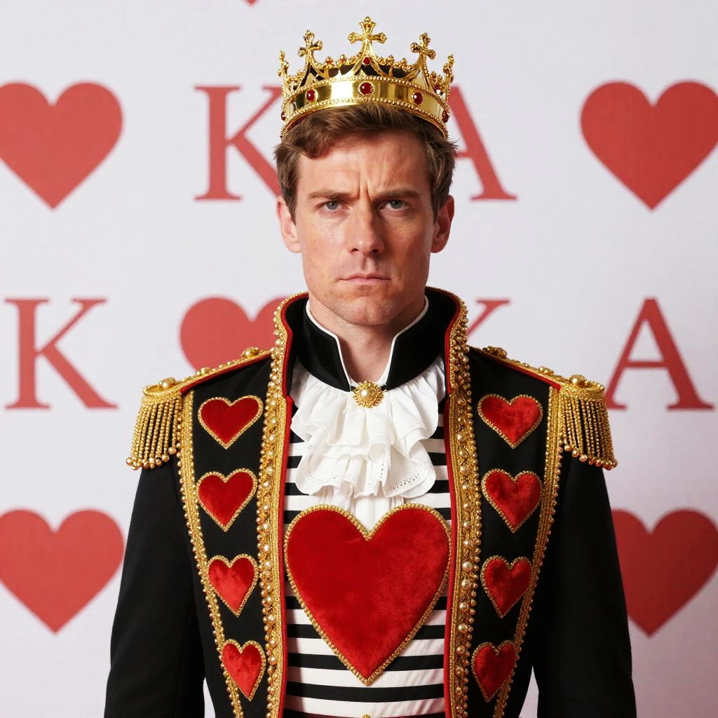 Photograph of a serious-looking man with short brown hair wearing an ornate, black and gold royal court outfit adorned with red heart shapes, a large red heart on his chest, and a gold crown. He has a white ruffled shirt with black and white striped details. The background is white with red hearts and "K A" symbols in red.