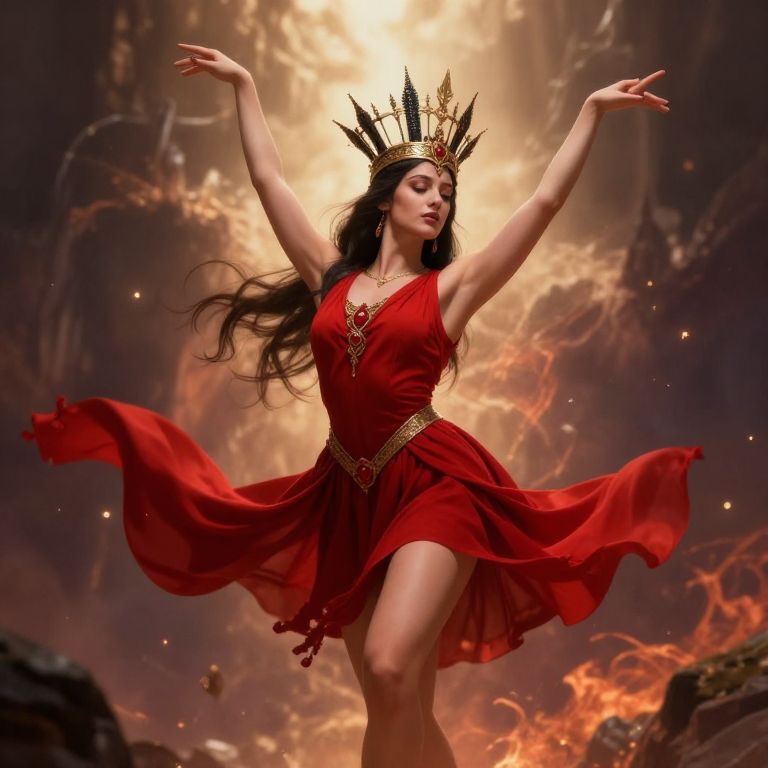 Photograph of a dancing woman with a light brown skin tone and curly dark hair, wearing a golden, liquid-like dress adorned with dripping honey and a crown of honeydrops. She holds a spoon in her right hand, raised above her head, while her left arm extends outward and her right leg is raised, creating a graceful pose. The background is a bright, golden-yellow gradient, and she stands in a pool of golden liquid that ripples outwards, adding a dynamic, flowing effect. Her expression is joyful, and the overall scene is whimsical and artistic, emphasizing fluidity and movement.