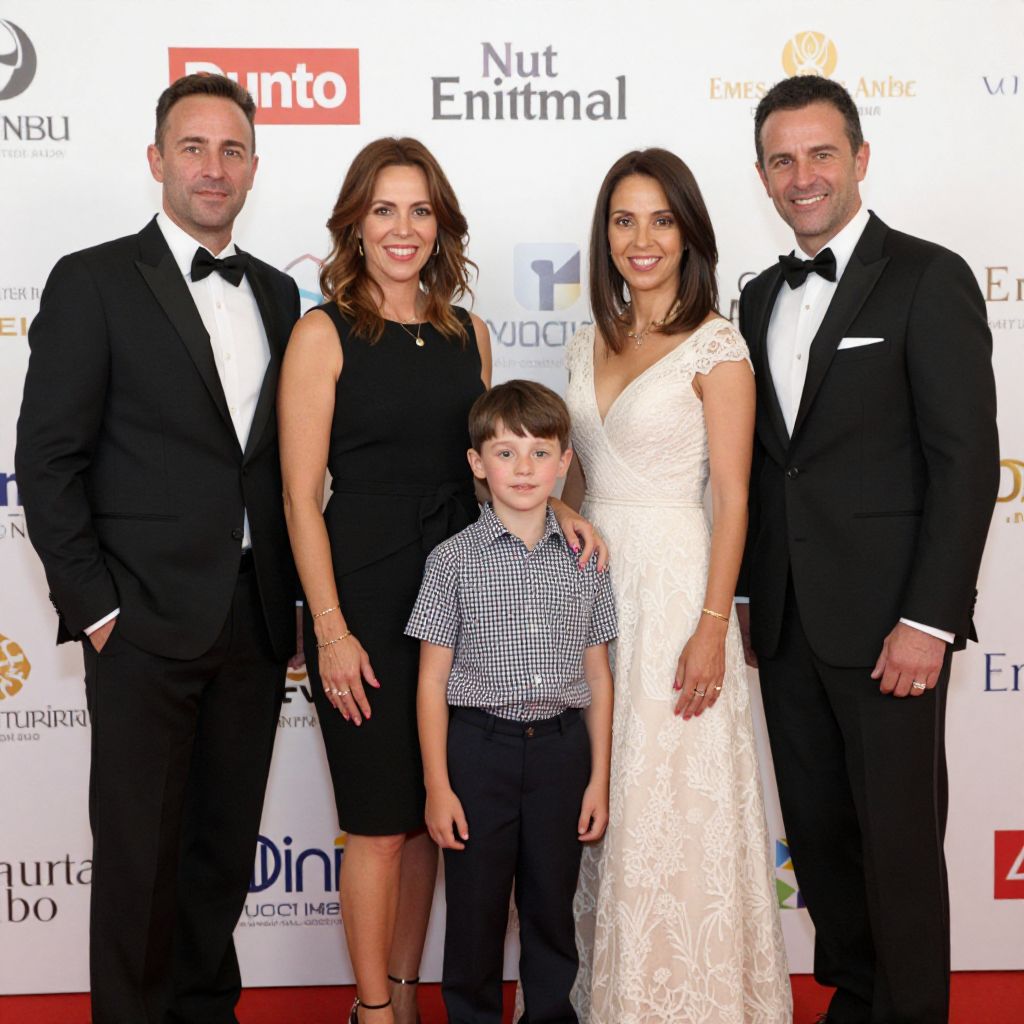 Group of five individuals posing together at a formal event, featuring two adults in black tuxedos flanking a woman in a black dress and another in a white lace gown, with a young boy in a checkered shirt positioned centrally between them, all smiling against a backdrop adorned with logos including \"Dunto,\" \"Nut Enitimal,\" and \"Emes Anbs.\