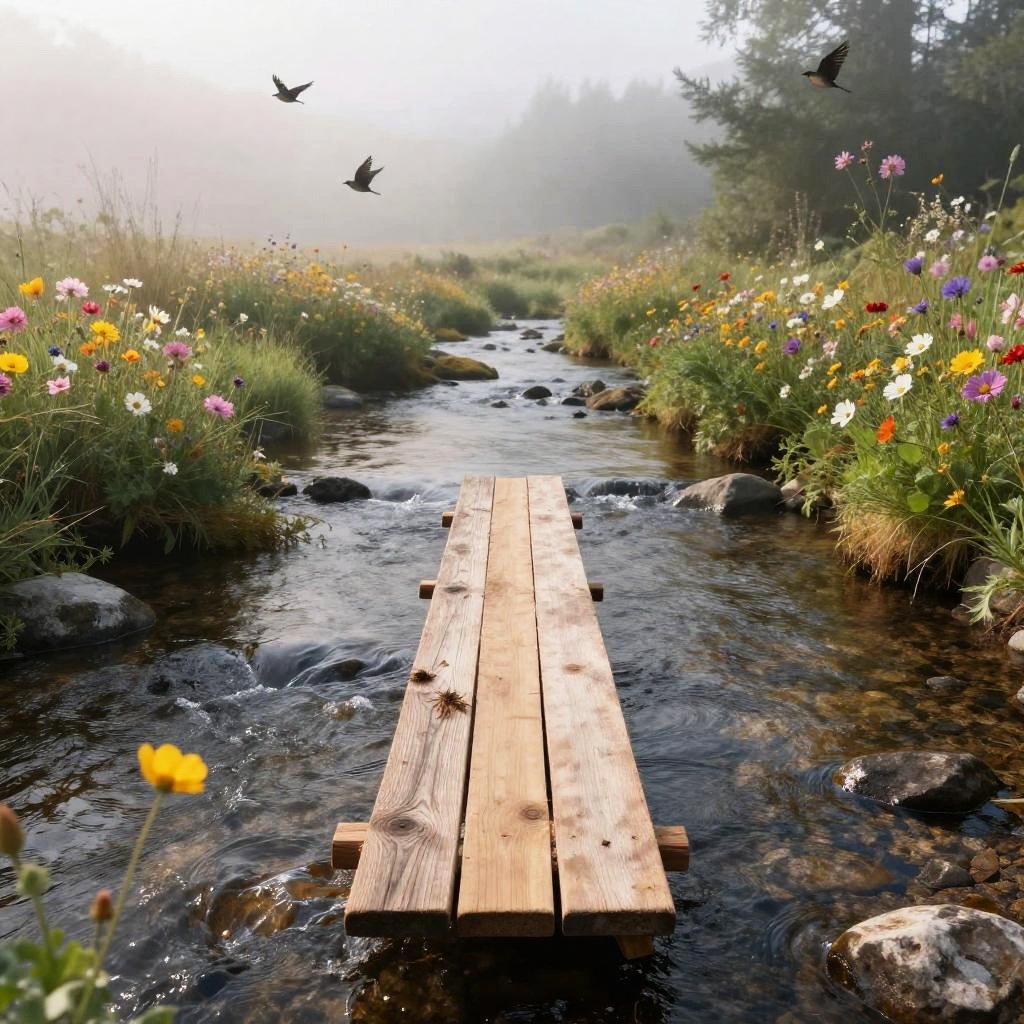 A rustic wooden springboard over a clear mountain stream, wildflowers growing along the banks, morning mist drifting above the water, birds flying overhead, a tranquil nature scene with vivid detail and a soft pastel palette.