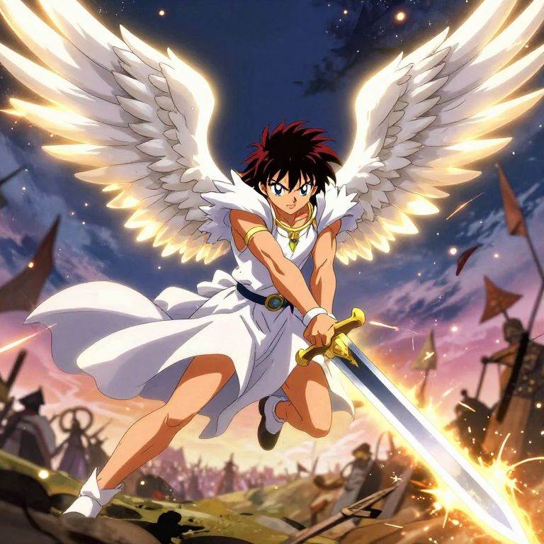Anime-style drawing of a fierce young warrior with glowing white wings, wielding a radiant sword, mid-jump against a twilight battlefield.