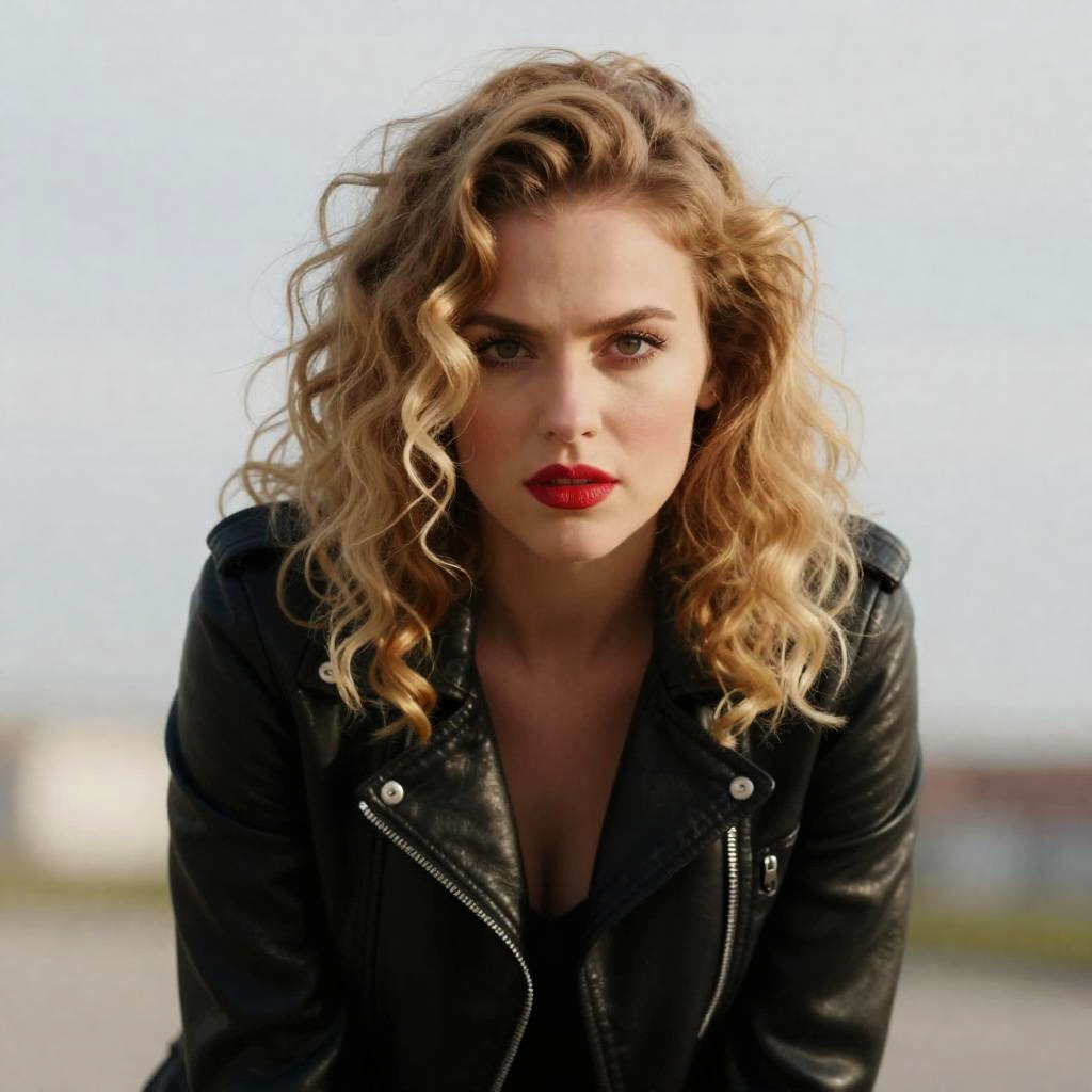 Blonde woman with curly hair, wearing a fluffy gray fur coat, smiling slightly. She has blue eyes, red lipstick, and a black necklace. Background is blurry greenery. Close-up, head and shoulders. Light overcast lighting.