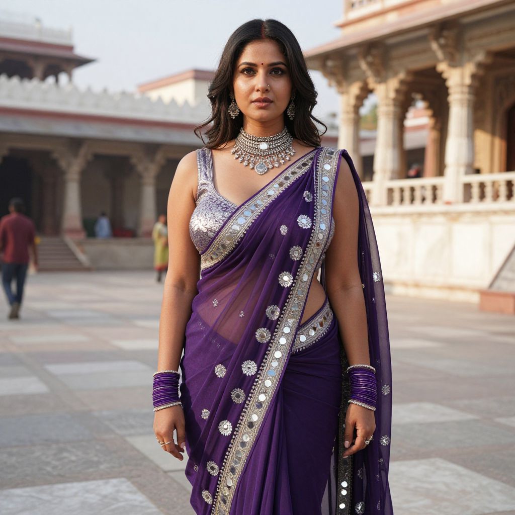 Photograph of a confident Indian woman with medium brown skin and long black hair, wearing a deep purple sari adorned with silver embellishments and a matching silver choker, bangles, and necklace. She has a curvy figure and is standing in an open courtyard with traditional stone architecture in the background. The sari's gold trim and sheer fabric add elegance. The lighting is natural, highlighting her poised stance and the intricate details of her attire. A person in a maroon shirt walks in the blurred background.