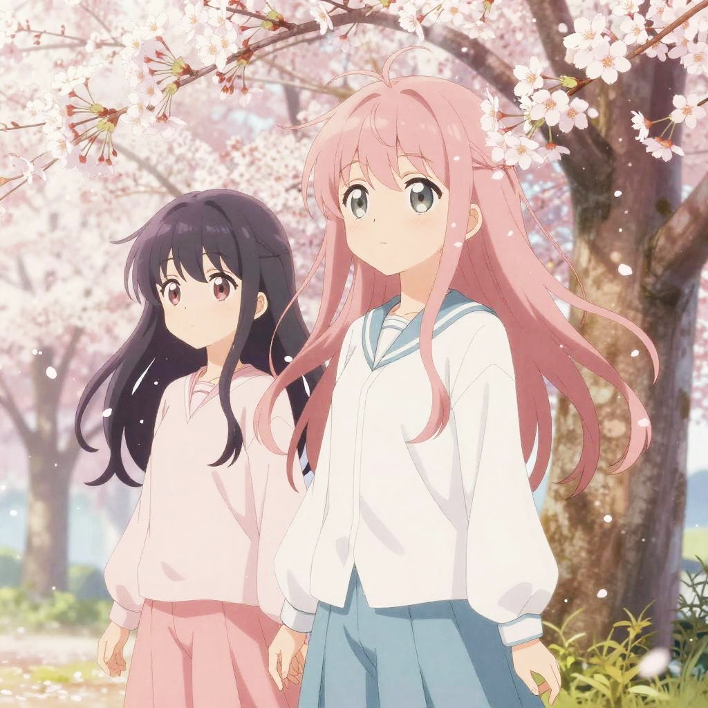 Long haired anime girls standing in a cherry blossom garden, soft pastel colors, detailed delicate petals, flowing hair gently moved by the wind, bright and dreamy atmosphere