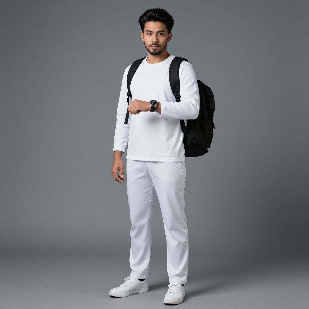 Photograph of a young South Asian man with short black hair, wearing a white long-sleeve shirt, white pants, white sneakers, and a