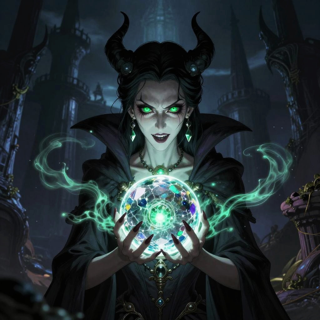 Realistic photo.a wicked sorceress, with piercing green eyes, holding a crystal orb, surrounded by swirling energies, in a dark tower, illustrated in the dramatic and gothic anime style of Kouta Hirano. realistic photo