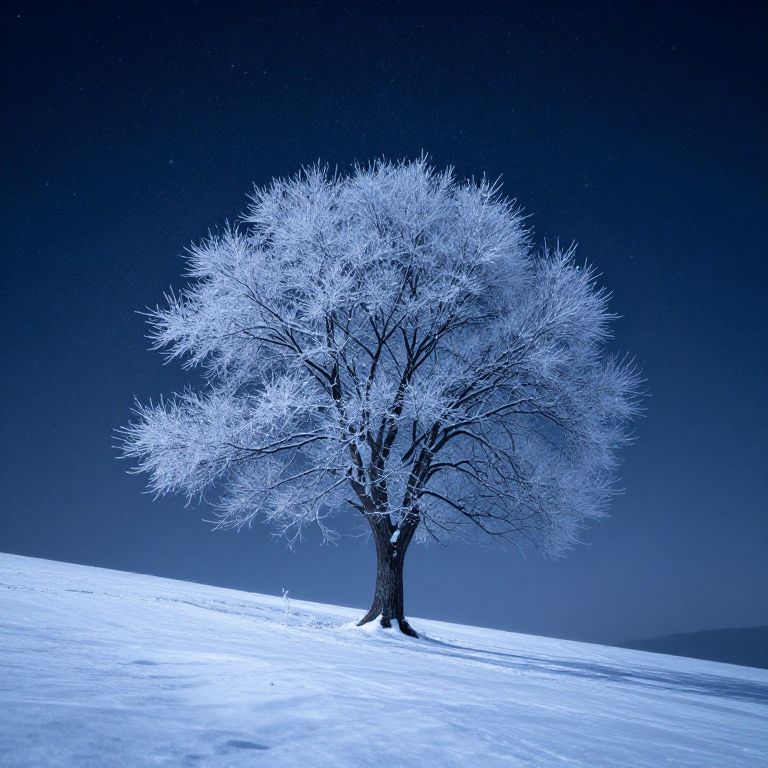 Photograph of a solitary, snow-covered tree with frost-laden branches, illuminated by moonlight, standing on a gently sloping snowy hill under a