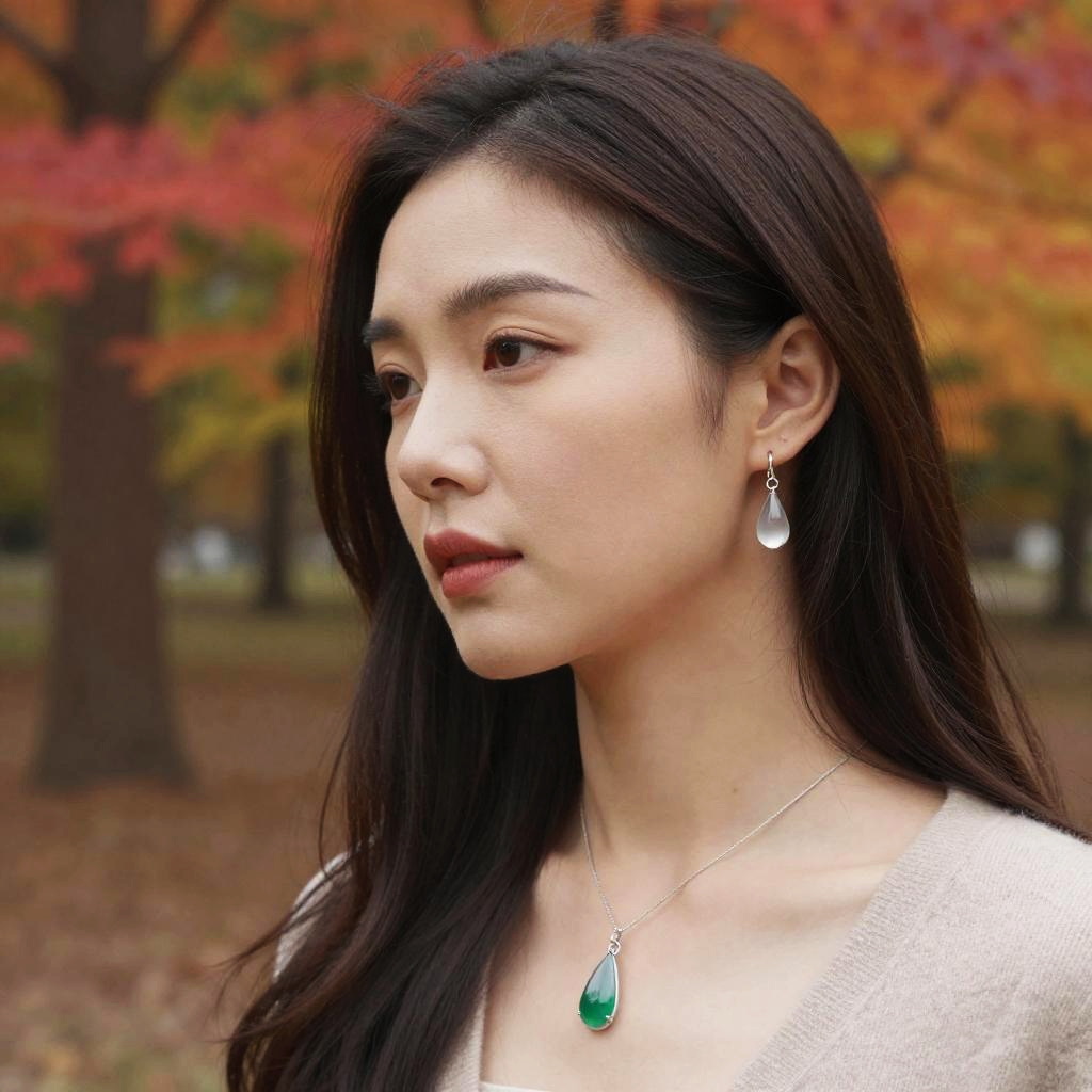 (RAW photo, best quality), (realistic, photo-realistic:1.30), 8k uhd, dslr, soft lighting, high quality, film grain, masterpiece, ultra realistic, 32k, extremely detailed CG unity 8k wallpaper, best quality, (autumn day ), lady, necklace, eardrop, stunning environment, vibrant colors