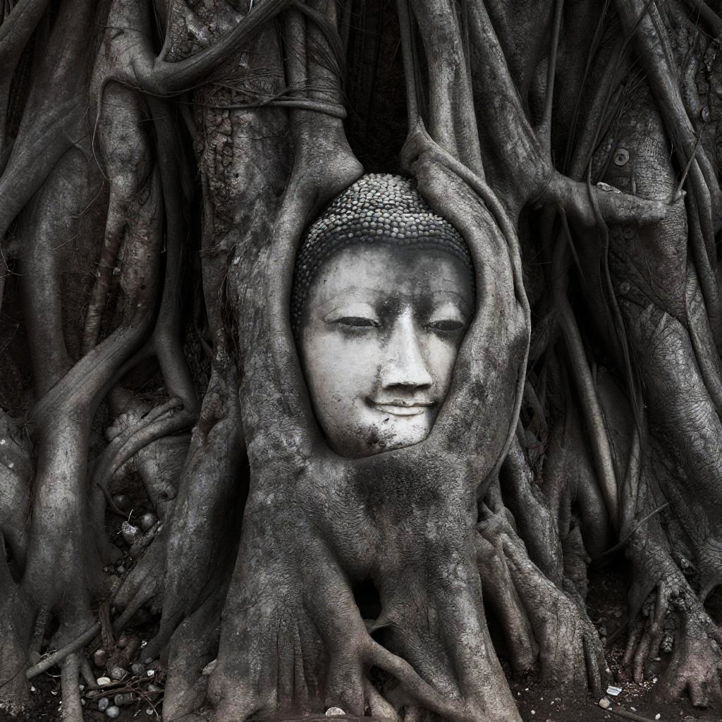 Photograph of a serene, ancient stone Buddha face partially hidden among thick, gnarled tree roots. The Buddha's face is calm with closed eyes and a slight smile. The tree roots, textured and dark brown, wrap around the stone, creating a natural, almost mystical frame. The image has a high contrast, black-and-white style, emphasizing the textures and depth of the roots and face.